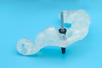当院はインプラント治療の際、シミュレーション結果をもとに「ガイド」と呼ばれる器具を患者さま一人ひとりに合わせて作製。手術時は、このガイドに沿ってインプラントを埋め込みます。